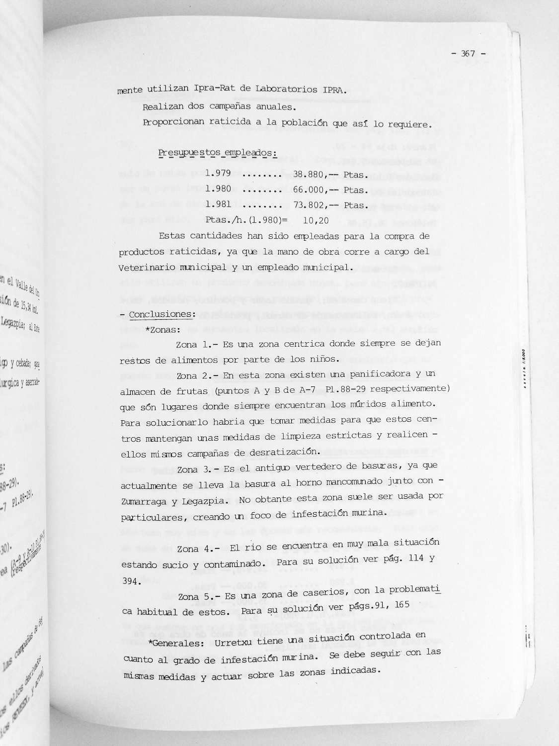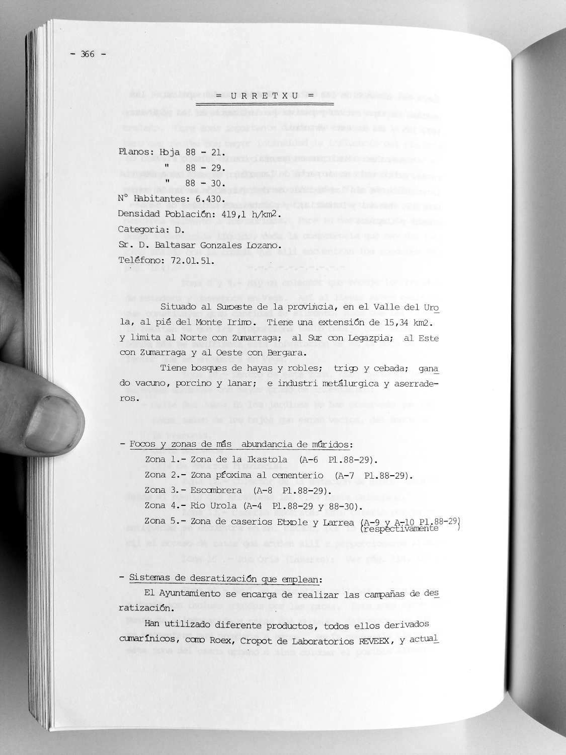 Ahora bien, toda esta teoría, se ve reflejada en el segundo bloque donde se analiza la problemática de ratas en cada uno de los municipios. Esta parte es tremendamente interesante. Cada pueblo tiene un capítulo (figuras 7-8). En primer lugar se hace un pequeño bosquejo geográfico y económico. Luego se analizan las zonas donde abundan los múridos, las cuales vienen señaladas sobre planos que se añaden a final del libro (figura 9). Luego viene un apartado donde se analizan los sistemas de desratización que se han empleado en el municipio. Vienen detalladas las diferentes partidas presupuestarias destinadas a este efecto y las empresas que las han realizado, caso de que el municipio no cuente con un servicio propio. Después viene el apartado de las conclusiones donde se explica qué debe corregirse para disminuir el número de ratas como arreglar el alcantarillado, mejoras en la recogida de basuras, etc., es decir, las medidas pasivas. Y por último se hace una valoración de las desratizaciones realizadas y qué hacer para mejorarlas.