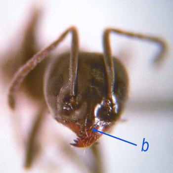 Respecto a las otras dos especies, las obreras tienen un cuerpo negro brillante y una longitud superior a los 2 mm. Para distinguirlas, hay que mirar en la parte inferior central del clípeo. Si vemos una muesca, estamos ante Tapinoma nigerrimum. Este detalle se puede ver en la imagen número 2 donde la muesca aparece indicada mediante una flecha azul. Las obreras de T. nigerrimum miden entre 2 y 5 mm. Y las de T. erraticum miden entre 2 y 3’5 mm.