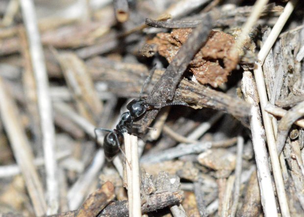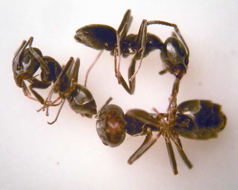 Se puede pensar que lo mejor hubiera sido intentar acabar a base de cebos con estas hormigas. Es un opción, pero cuando ves que hay tantas hormigas que van por todas partes, el cebo puede ser insuficiente. Además, es probable que se trate de alguna especie que no tuviera un solo nido. Recogí una muestra de obreras. En casa, a través de la lupa binocular, las he identificado como hormigas del género Tapinoma. Y más en concreto, como pertenecientes a la especie Tapinoma nigerrimum. No es fácil identificar especies de hormiga. Sin embargo, con la ayuda de una lupa binocular, una buena guía y paciencia, se consigue.