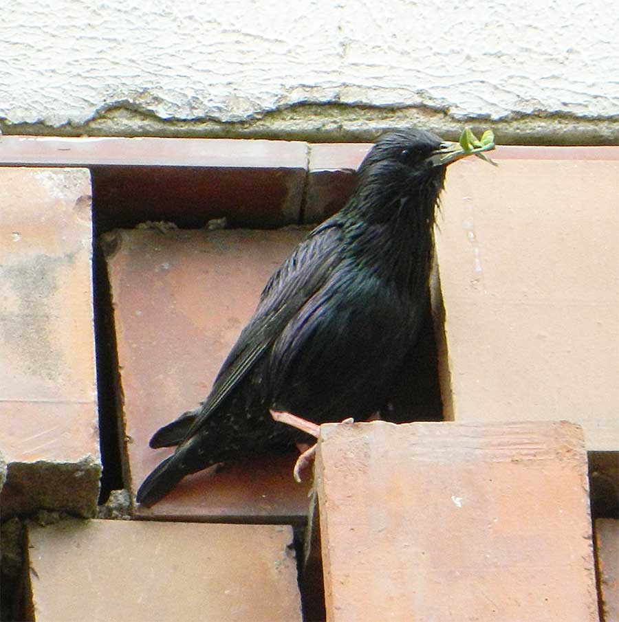 Las fotos de este posteo las hice en Cabrera de Mar (Barcelona). Pasé delante de una casa que tenía toda una pared de la fachada con unos ladrillos ornamentales que dejaban cavidades. En estas cavidades había una colonia de estorninos. Hace años, en este edificio, había estornino negro. En estos momentos, el estornino pinto había tomado el lugar y estaba en plena faena de buscar pareja. Como curiosidad, en la fotografía número 1 se puede ver un estornino con una ramita verde en el pico. Se trata seguramente de un ejemplar macho. Cuando llega el momento de buscar pareja, el macho busca un agujero para hacer el nido. Entonces decora el lugar con ramitas verdes. Mejor si son olorosas y atraen a la hembra. Mientras hace esto, no para de cantar. A mí me parecen extraordinarios sonidos de gran belleza y variedad. Cuando la hembra accede a ser la pareja, se apresta a desmontar la decoración y en montar un lugar más apropiados. Tras la cópula, esta pondrá unos cuatro huevos. Con esto se iniciará un nuevo ciclo. Y a seguir expandiéndose.