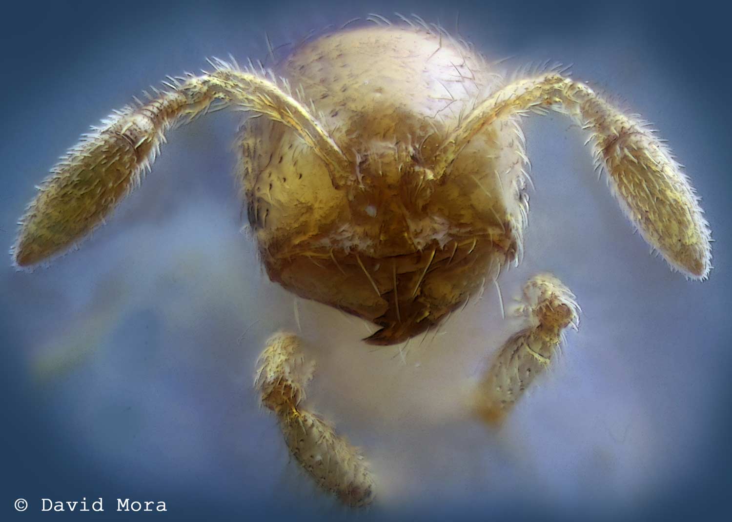 En cuanto vi las hormigas me picó la curiosidad por verlas de cerca. A la que pude me desplacé al local del cliente. Aproveché para recoger más hormigas. Quería observarlas a la luz de la lupa binocular y sacar unas fotos nítidas. Pero no conseguí una imagen decente. No tenía las herramientas adecuadas. Entonces pedí ayuda a David Mora si podía tomar unas imágenes de tan pequeña hormiga. Cuando se trabaja en modo macro y con tantos aumentos, la pérdida de profundidad de campo es muy grande. David toma una imágenes espectaculares sacando muchas fotos al desplazar el foco sobre el objeto y apilándolas luego con un programa informático. De esta manera se consigue una imagen enfocada en todos sus detalles. En fin, David me hizo el favor y me mandó las dos magníficas imágenes que se pueden ver en esta entrada (figuras 1 y 2). Le doy las gracias por dedicarle tiempo y esfuerzos.