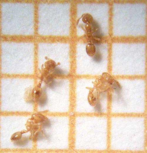 Para hacerse una idea del tamaño de estas hormigas, hay que ver la imagen número 3. Las obreras están sobre papel milimetrado. Superan el milímetro, pero no por mucho. Cuando mi compañero biólogo me las enseñó, me puso delante una caja y me dijo: «Mírate esto. ¿Sabes decirme qué es?» Yo me quedé mirándolo y no supe decir nada. No veía bien qué era. De hecho, el cliente que nos las envió, llamó diciendo que tenía unos bichos de la madera. Tampoco veía qué era y al estar sobre una madera, pensó que sería algo como carcoma.
