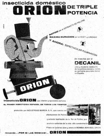 En 1962, aparecen varios anuncios en el periódico ABC donde se publicitan dos mejoras en el producto (figura 7). Una es la incorporación de decanil que es anunciada como «ultra y moderna revelación de la química alemana, cedido en exclusiva para esta marca en España». Desconozco a qué compuesto se refieren con el nombre de decanil. Parece que le confería una capacidad espectacular de fulminación. Tiene toda la pinta de ser un sinérgico. Parece mentira que además de los 3 letales insecticidas le añadieran un sinergista. Pero manda la innovación porque la competencia aprieta. Cuanto más mortífero fuera, mejor. La otra mejora sí la considero importante. Orion empezó a venderse en envases de aerosol. Con este sistema de pulverizar se conseguía una gota más fina y se dispersaba mejor en el ambiente que con el uso de los pulverizadores de émbolo. El insecticida en envase de presión para generar aerosol fue rápidamente aceptado por el público por práctico y poco engorroso. Usar y tirar.