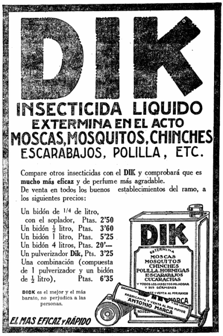 También en 1928, Antonio Marca comercializa el insecticida Dik, tal y como aparece en la publicidad de diversos diarios (figura 8). Este insecticida se vendía en latas para rellenar el clásico pulverizador de émbolo. Dik siguió el camino de marcas importantes de la época como Flit, Fly-Tox o Excelsior. De hecho, el nombre del producto no es más que una imitación de la palabra Flit, el más exitoso de los insecticidas de la época [3]. El rojo fue el color elegido para la imagen de marca. La composición sería muy similar en todos estos productos, es decir, extracto de pelitre diluido en un solvente orgánico.