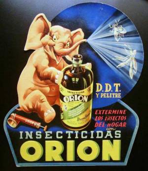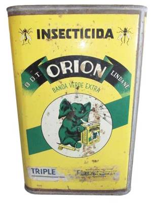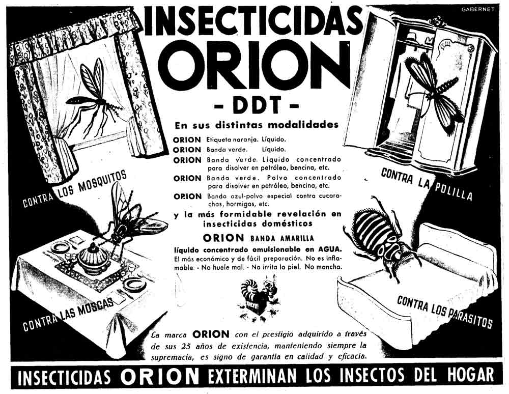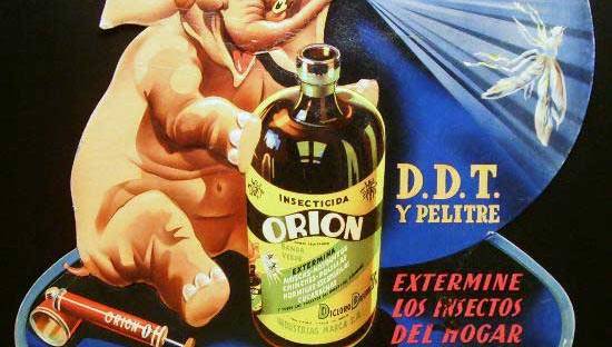 Con la llegada del DDT, Orion dio el salto hacia los organoclorados con una fórmula más tóxica y efectiva. En el periódico La Vanguardia aparece un primer anuncio en junio de 1946 (figura 1), en el que se puede leer una amplia gama de formulados como líquido listo para usar, concentrado emulsionable o polvos para espolvoreo. Gracias a productos a base de DDT, en España conseguimos sacarnos las chinches de cama. Orion fue creado para el ámbito doméstico, aunque la compañía hizo alguna incursión en el mercado de los insecticidas agrícolas bajo la marca de Agro-Orion.