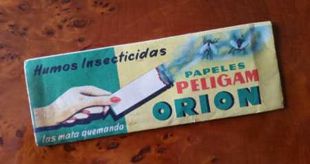 La evolución de las diferentes fórmulas y formulados de Orion no es más que un calco de otras compañías. A la cabeza de los insecticidas para el ámbito doméstico estaba, sin duda, Cruz Verde de Barcelona, que además era fabricante de organoclorados. Hacia 1952 aparece el papel fumígeno Orion Peligam listo para quemar con lindano (15%) y extracto de pelitre (30%). Un formulado que tuvo mucho éxito y que todas las demás marcas de insecticidas domésticos tuvieron. En este mismo año, Orion incorpora lindano, otro organoclorado que hace su composición más letal. Se publicita bajo el rótulo de ‘triple efecto’, ya que contiene pelitre, DDT y lindano.