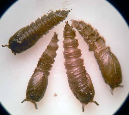 En la imagen número 3 se pueden ver algunas de las pupas que recogí vistas a través de la lupa binocular. Cuando destapé el frasco de muestra donde las llevaba, salieron volando algunas moscas que habían ya completado su estadio de pupa. Observando la pupa se puede reconocer algo de la forma de la futura mosca. Lo que destaca es la forma de las alas plegadas hacia la zona ventral. En la parte de la cabeza, que es la más gruesa, se pueden ver dos trompetas que sirven para que la pupa respire en el agua. Las larvas de mosquito también disponen de ellas.