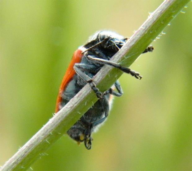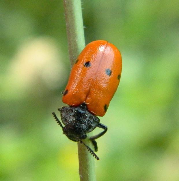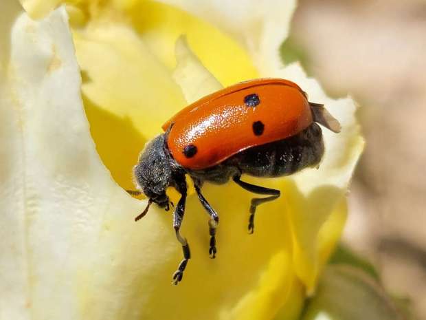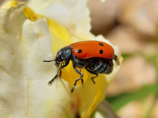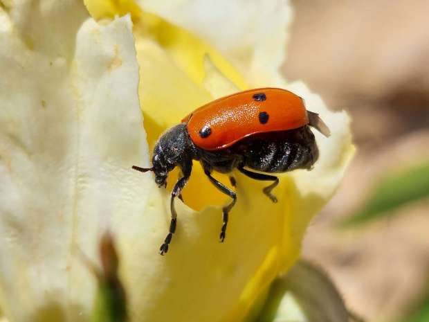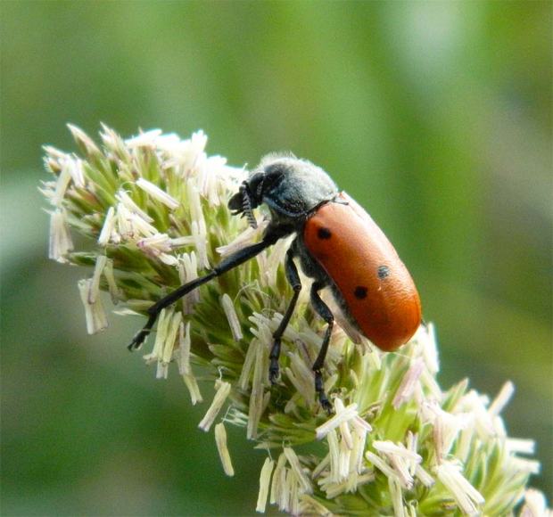 En la Serralada de la Marina, en Barcelona, es común ver sobre plantas y arbustos al escarabajo de seis puntos (Lachnaia sexpunctata). Es un coleóptero que no huye de nosotros. Puedes acercarte para hacerle una foto que a penas se moverá. Es de movimientos lentos. Parece torpe. Cuando lo observas con detalle, ves que extiende al máximo sus patas para agarrarse. El escarabajo de seis puntos que suelo ver cerca de donde vivo es de color rojo. Aunque también puede tener los élitros amarillos o de un color intermedio entre el rojo y el amarillo. A la hora de identificarlo se puede confundir con escarabajos del género Clytra o Macrolenes. Estos, a diferencia de los del género Lachnaia, tiene el pronoto liso y brillante. En cambio, el escarabajo Lachnaia lo tiene velludo. Pero lo mejor para reconocerlo es los seis puntos que tienen sobre los élitros. Tres sobre cada uno de estos formando una L. Es un insecto fitófago y voraz. Un problema para jardines y huertos. Mide unos 12 milímetros de largo.