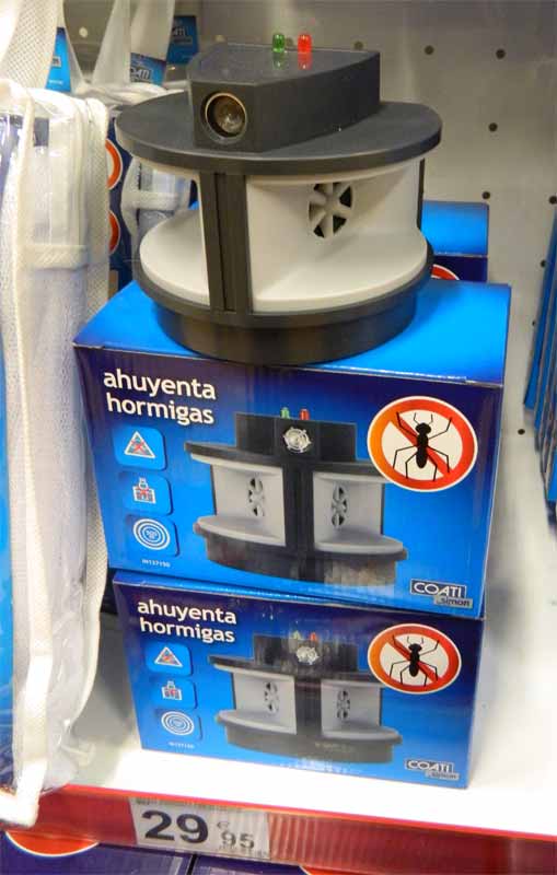 He de hacer constar que todos los aparatos anteriores ya los había visto. Y también hago constar que mi desconocimiento de lo que me rodea es grande, cosa de lo que me alegro porque siempre hay algo que me sorprende. Y con algo sorprendente me encontré. En la estantería había un aparato que no había visto antes. Se trata de un chisme contra las hormigas (foto 6). ¡Increíble! Y yo gastando gel insecticida, que no es precisamente barato, para poner coto a las hormigas en lugares de difícil control como un obrador de pastelería. Sufriendo en un cliente para exterminarle la hormiguita, cuando le podría colocar uno de estos aparatos en cinco minutos y me marcho en mi furgoneta pitando a otro cliente. ¡Qué sinsentido! Hay que mirar con detalle este aparato porque el diseño es innovador. Si tuviera que explicar a alguien a qué se parece, no sabría decir a qué. Pero sí parece que lleva dos altavoces que cubren un ángulo de 180 grados. Aunque lo mejor son los dos leds que tiene. Uno verde y otro rojo. Seguramente, si el verde se ilumina, es que el aparato está funcionando en modo exterminio total. Si eres una hormiga, pronto te darás cuenta de que en esa casa no te quieren. Me hizo gracia el aparato. Me quedé con la duda de comprarlo y testearlo. Pero el precio me pareció prohibitivo. Vale el sablazo de 29 euros con 95 céntimos. Mejor lo dejo para otra ocasión. O quizás se lo regale a alguien para el cumpleaños. Y si no le funciona, lo puede poner en una estantería para decorar. Para finalizar, dejaré constancia de que estoy pensando en escribir a Simon y proponerle un aparato contra chinches. A ver si de esta manera nos ayuda con este problemón que tenemos las empresas de control de plagas.