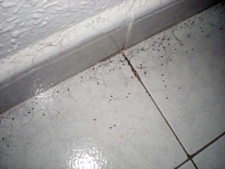 Además de estos insectos, en el lavabo y en la cocina había dos especies de dípteros: mosca de urinario (Clogmia albipunctata), y una mosca pequeña y negra que hace tiempo que voy detrás de su identificación. Creo que se trata de Leptocera caenosa, de Leptocera fontinalis o de una especie similar. Suelo encontrármela en lugares donde los bajantes no está bien sellados y hay mucha humedad y materia orgánica en descomposición. En el lavabo había además ácaros rojos, quizás alguna especie de la familia Erythraeidae. Pero estas especies estaban en poca proporción, si lo comparamos con los estafilínidos. En el pasillo de este piso, se podían ver algunos escarabajos volando. Llegaban hasta una pared o hasta el suelo y allí se quedaban. Como se puede ver en las fotografías, en los perfiles del suelo se iban acumulando los escarabajos muertos. También había escarabajos por encima de los muebles. Lo cierto es que no tuve mucho tiempo para seguir investigando. Tenía que realizar el tratamiento y luego marchar a otro cliente.