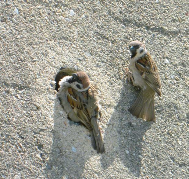 Paseando por el parque fluvial del río Besós, a la altura de Sant Adrià (Barcelona), me encontré en una zona con una pequeña colonia de gorrión molinero (Passer montanus). Me fijé en una pareja que estaban dando de comer a sus polluelos. El nido estaba en un mechinal de la pared de hormigón que delimita el parque. A diferencia del gorrión común (Passer domesticus) [1], el molinero no tiene dimorfismo sexual, ya que tanto el macho como la hembra son iguales en plumaje. El gorrión molinero puede ser confundido con un macho de gorrión común, ya que tiene una coloración muy parecida. Sin embargo, hay diferencias. Véase la imagen número 1. Una importante es que el macho de gorrión común tiene sobre la cabeza una mancha gris. Otra es que el gorrión común carece de la mancha negra que el molinero tiene en la mejilla.