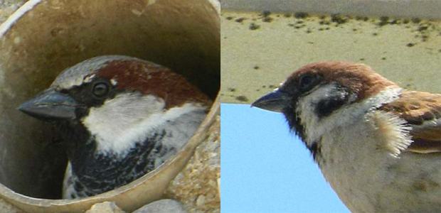 Fig 1. A la izquierda, gorrión común macho (Passer domesticus). A la derecha, gorrión molinero (Passer montanus)./ C. Pradera 05-2013
