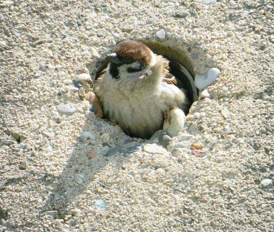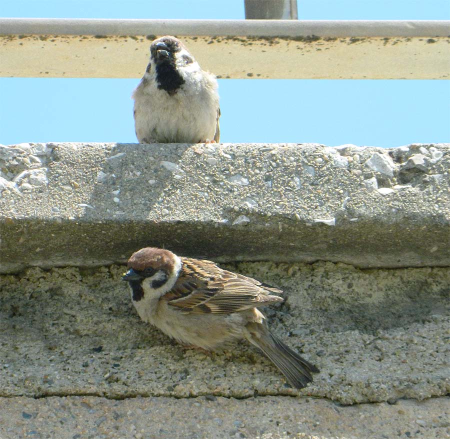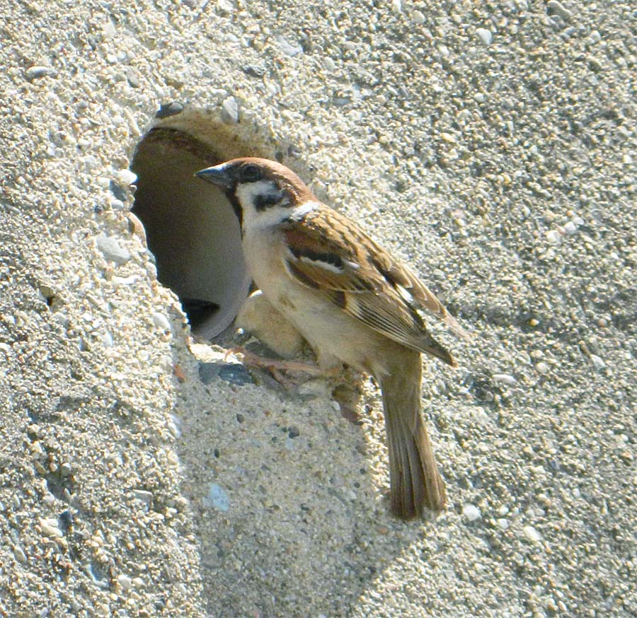 Paseando por el parque fluvial del río Besós, a la altura de Sant Adrià (Barcelona), me encontré en una zona con una pequeña colonia de gorrión molinero (Passer montanus). Me fijé en una pareja que estaban dando de comer a sus polluelos. El nido estaba en un mechinal de la pared de hormigón que delimita el parque. A diferencia del gorrión común (Passer domesticus) [1], el molinero no tiene dimorfismo sexual, ya que tanto el macho como la hembra son iguales en plumaje. El gorrión molinero puede ser confundido con un macho de gorrión común, ya que tiene una coloración muy parecida. Sin embargo, hay diferencias. Véase la imagen número 1. Una importante es que el macho de gorrión común tiene sobre la cabeza una mancha gris. Otra es que el gorrión común carece de la mancha negra que el molinero tiene en la mejilla.