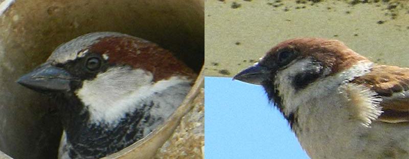 Fig 1. A la izquierda, gorrión común macho (Passer domesticus). A la derecha, gorrión molinero (Passer montanus)./ C. Pradera 05-2013