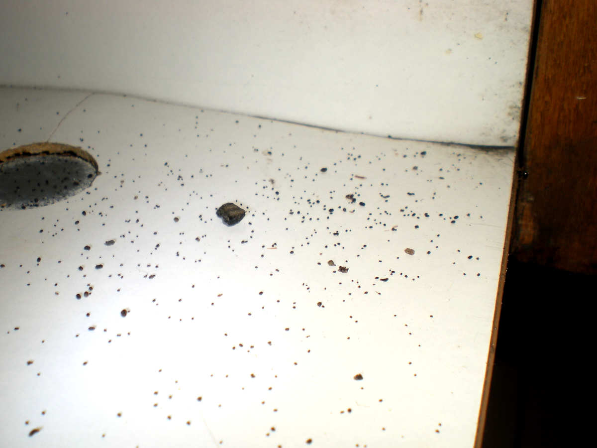 El tema que planteo con esta entrada es cómo localizar la cucaracha germánica en una cocina doméstica. Si sospechamos que tenemos cucaracha germánica, es necesario que se inspeccionen con detalle los armarios de la cocina. Estos suelen ser de color blanco en su parte interior, lo cual facilita la tarea. Lo que debemos buscar son los excrementos, que es la evidencia de que allí hay cucarachas [2]. En las imágenes 2 y 3, se pueden ver las esquinas delanteras de un armario que está justo debajo de una fregadera. Los excrementos son de entre 0’5 y 1’5 milímetros. Su color es oscuro. En la imagen 1 se pueden ver excrementos que recogí ayer. Los he puesto sobre papel milimetrado para hacerse una idea de su tamaño. Lo más parecido que me viene a la cabeza, por hacer una comparación, es la pimienta molida. Si vemos algo parecido en las esquinas de los muebles, es que por allí tenemos cucarachas.
