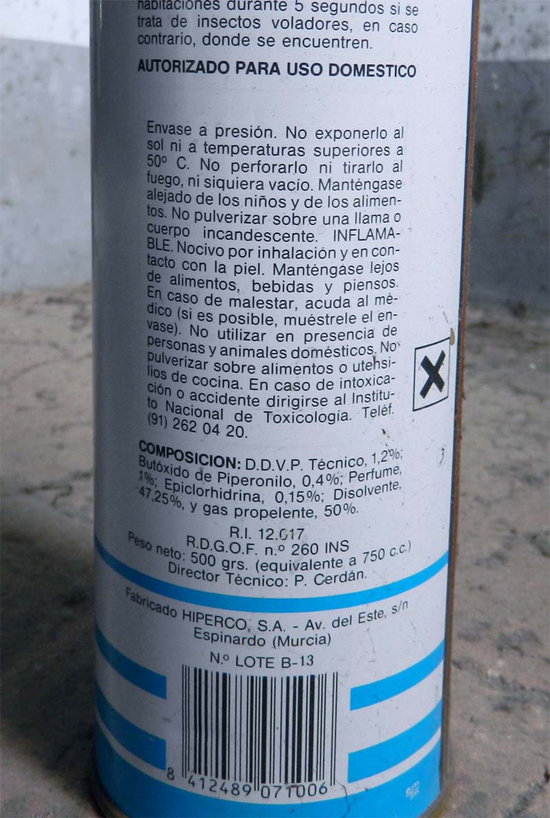 El envase que encontré contenía DDVP técnico también llamado diclorvós o vapona. Esta materia activa insecticida es un organofosforado cuyo uso fue prohibido en la Unión Europea en diciembre de 2008. Aunque, seguramente, para uso doméstico parece que fue reducido su uso en la década de 1990. Creo que esta es la razón por la que en la Guía de Plaguicidas que editó el MISACO en 1998 el diclorvós quedó restringido al uso por personal especializado. Si no es así, no se entendería que Hiperco hubiera cambiado la composición. Los piretroides son menos residuales y eficaces que un organofosforado como la vapona. Parece ser que la Enviromental Protection Agency de EUA ha estudiado en varias ocasiones la posibilidad de prohibirlo. Aunque los estudios sobre la potencial capacidad cancerígena de esta materia activa no son concluyentes. En aquel país está todavía autorizado su uso.