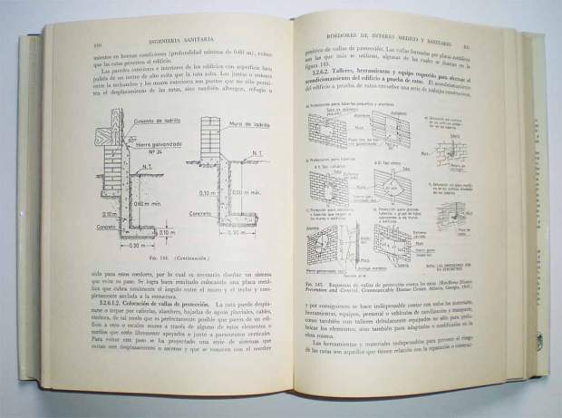 Fig 2. Interior del libro ‘Ingeniería sanitaria’ de 1969, páginas 650-651, donde se ven esquemas para realizar construcciones a prueba de ratas./ C. Pradera 07-2013
