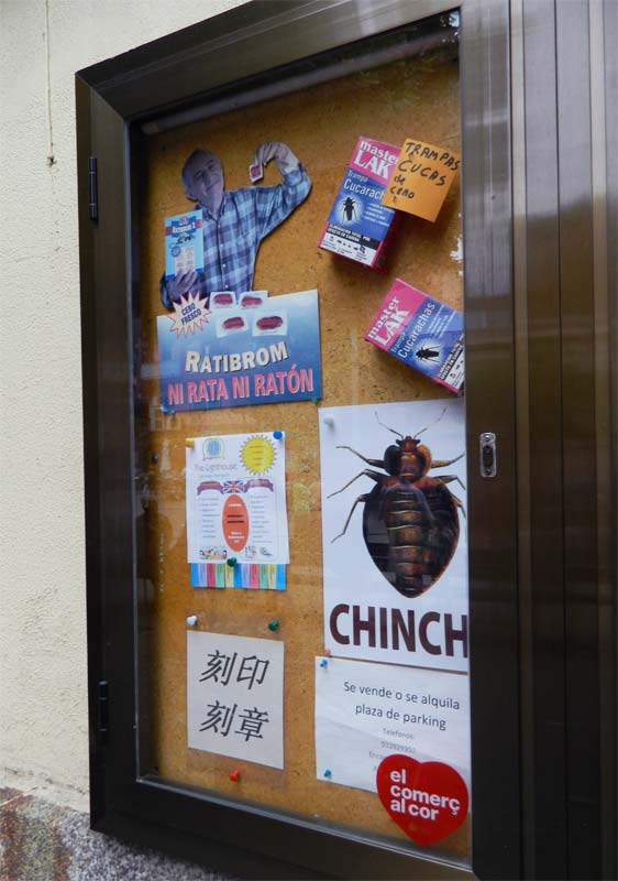 Las fotos las hice un festivo que estaba cerrada la droguería. Los escaparates no tienen desperdicio. En la fotografía número 2, se puede ver una cucaracha de trapo. También destaca una foto de una chinche. En el barrio del Fondo hay mucha inmigración que no siempre conoce bien nuestro idioma. Una foto vale más que mil palabras. Me encuentro a menudo, cuando voy a un restaurante de chinos o paquistaníes, que se me acercan para decirme que en casa tienen unos bichos que pican. Lo explican como pueden. Pero con pocas palabras basta. En seguida me doy cuenta que me piden ayuda con las chinches. En la foto número 3 se puede ver ampliado el cartel publicitario de Boralac, que se vende bajo el título de «insecticida permanente». Este insecticida es fabricado por Quimiopen y contiene las materias activas deltametrina (0’1%) y permetrina (0’1%). Es bastante atrevido decir hoy en día que un insecticida es permanente. Pero como ya sabemos, mientras nadie te de un toque y te baje los humos, tira palante. Pensemos que esta misma casa comercial fabrica el insecticida Zum bajo el fantasioso título de «un año sin insectos». En la foto número 3, se puede ver el otro escaparate. Aparece otro producto milagroso como es Masterlak de Química de Munguía que se vende bajo el título de «insecticida definitivo 1 año». Deberían las autoridades competentes poner coto a la publicidad engañosa. Todas estas lacas no van a librar a nadie de las chinches. Bastante difícil es para nosotros los profesionales del control de plagas eliminar de una casa las chinches, como para pensar que una persona con Boralac o Masterlak va a poder con estas. Lo que sí van a conseguir es que alguien se maree con los gases que contienen estos aerosoles. De los productos que hay en los dos escaparates, el único que va a ser útil es el gel Blattanex de Bayer. Eso sí, poniendo el gel donde hay que ponerlo.