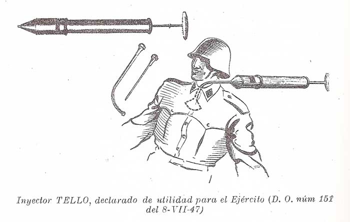 En el libro ‘Práctica de la moderna desinsectación’ de Gonzalo Piédrola Gil publicado en 1950 [2], se mencionan varios productos fabricados por Industrias Químicas Tello. Estos son: fumígenos Fum (para la desinsectación de grandes locales, primer insecticida de humos fabricado en España), cigarrillos insecticidas Fum (contra moscas y mosquitos), pulverizable Fum (líquido para pulverizador de émbolo), e insecticida Fum (polvo para espolvoreo). Según Gonzalo Piédrola Gil, además de la aportación del primer fumígeno, Tello construyó los primeros aparatos para para el espolvoreo de grandes colectividades de personas sin necesidad de desnudarlos. En la imagen número 4 se puede ver un dibujo del inyector Tello que aparece en el libro. Este aparato permitía inyectar insecticida dentro de los soldados con vistas a despiojar de piojos del cuerpo (Pediculus humanus humanus). Este insecto es vector de varias enfermedades como el tifus exantemático que, en el pasado, diezmaron la soldadesca de numerosos ejércitos. Más de una batalla se perdió por los piojos. Este inyector estaba pensado para la aplicación de polvo insecticida en colectividades de no más de 100 personas. Tenía varios tipos de boquillas para diferentes aplicaciones.