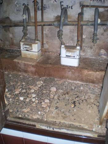Pensaba que tanto excremento se había acumulado durante algunos años. Un vecino me dijo que no, que hacía un año que él había hecho una limpieza en este armario. Todavía lo pintaba peor. Imagino la cara de la persona que realizó la lectura de los contadores al ver este panorama. Esperemos que se encontrara con la rata muerta casi en los huesos. Una rata muerta desprende un olor nada agradable. La finca era antigua. Quizás fuera construida en la década de 1920 o 1930. La acometida del gas era todavía de plomo. Lo más seguro es que las ratas alcanzaran este armario desde la calle siguiendo la entrada del tubo del gas.