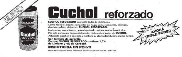 La marca de insecticidas CUCHOL fue creada por Insecticidas Cóndor a mediados de la década de 1940. CUCHOL era la marca dirigida al mercado doméstico. Insecticidas Cóndor, junto con Standard Química, fue uno de los grandes productores de HCH y lindano en España. Ambas empresas estaban en Vizcaya y dejaron tras de sí terrenos contaminados y numerosos vertidos ilegales. Insecticidas Cóndor fue creada en 1944 en Baracaldo. En 1966 trasladó su actividad industrial a Amorebieta [2]. En 1985 cesó sus actividades de producción de insecticidas en esta fábrica. Los productos insecticidas pasaron entonces a ser fabricados por Rhone-Poulenc Agroquímica. En 1988 fue absorbida por Rhone-Poulenc Agroquímica [2]. Es por esta razón que en la etiqueta de CUCHOL REFORZADO aparece Insecticidas Cóndor como titular de la inscripción y, Rhone-Poulenc Agroquímica como fabricante. Esto indica que CUCHOL REFORZADO fue fabricado por esa época, como así lo atestigua un anuncio publicado en el periódico ABC en 1989 (figura 2).