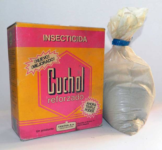 Hace un par de meses encontré una caja de CUCHOL REFORZADO (figura 1). Para mi sorpresa, dentro del envase de cartón estaba el producto sin desprecintar. La caja contenía una bolsa de 1 quilo con insecticida formulado en polvo para espolvoreo. En un lateral de la caja (figura 3), se puede leer que este polvo contiene 1’5% de lindano y 4% de carbarilo. Buena y letal combinación la de un organoclorado y un carbamato.
