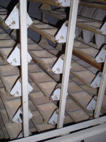 En un obrador de pan es fácil encontrarse con el escarabajos de la harina de la familia Tenebrionidae. Es común encontrar las especies Tribolium confusum y Tribolium castaneum. Pero también otras como Gnathocerus cornutus, conocidas vulgarmente como escarabajo cornudo de la harina [1]. Por lo menos, yo me los encuentro a menudo. Algunos obradores acumulan más harina en las esquinas que otros. Cuanta más harina y menos limpieza, mejor para estos escarabajos. Un lugar para encontrarlos es en las máquinas para elaborar el pan como la que se ve en la imagen número 1. Se trata de una gran máquina en la que se deposita la masa ya elaborada con la que luego se dará forma de barra de pan. En la imagen número 2 se puede ver la máquina en su interior.