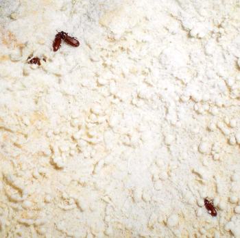 Según he visto, el pan desciende en forma de bola hasta los canastillos donde van dando vueltas como si de una noria se tratara. Luego salen por otro lugar y otra máquina le da forma de barra de pan. Estos canastillos no se suelen limpiar a menudo. Son metálicos y están recubiertos de tela gruesa. La harina se va incrustando en la tela. Cuando visito los obradores de pan para hacer una revisión, estas máquinas suelen estar paradas. Es entonces cuando el escarabajo cornudo de la harina aprovecha para salir. En la imagen número 3 se pueden ver cuatro escarabajos que en la harina. La larva se alimenta de la harina o de la masa para hacer pan. La humedad les beneficia.