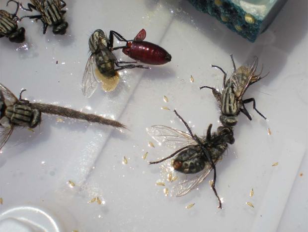 La familia de los sarcofágidos incluye un gran número de especies. Constan 134 para la Península Ibérica [1]. Algunas son parásitas de otros insectos. Y otras, como las del género Sarcophaga, necesitan carroña para el desarrollo de las larvas. Este género es el más numeroso de esta familia. La hembra adulta deposita las larvas directamente sobre la carroña, a diferencia de otras moscardas que depositan los huevos. La hembra incuba los huevos y eclosionan en su interior. En la imagen número 2 se pueden ver pupas eclosionadas que estaban debajo del ratón muerto. Y en la imagen número 3 se pueden ver los adultos que salieron del estadio de pupa y quedaron atrapados en el adhesivo.