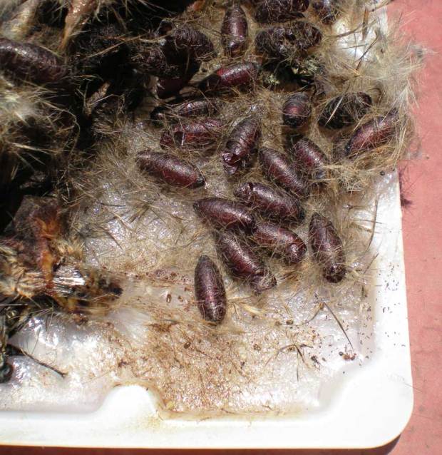Las moscardas sarcófagas (Sarcophagidae) están entre mis dípteros preferidos. Son de gran belleza. Hace unas semanas estaba realizando una desratización en un cliente en el que no usamos rodenticida en los interiores. En los puntos de control situamos planchas encoladas con un bloque de atrayente. En uno de los puntos situados en el exterior quedó atrapado un ratón moruno (Mus spretus) que al morir fue aprovechado por las moscas para proliferar (figura 1).
