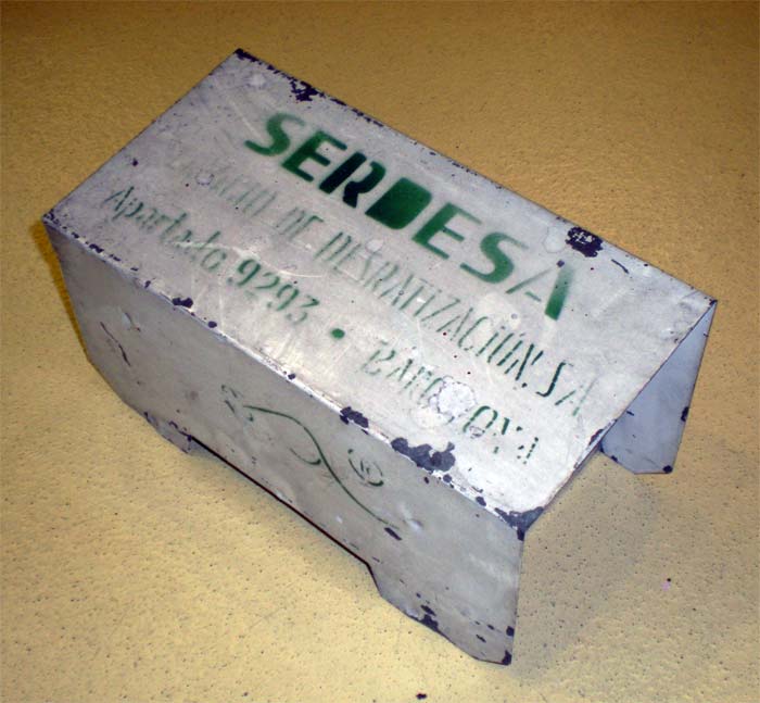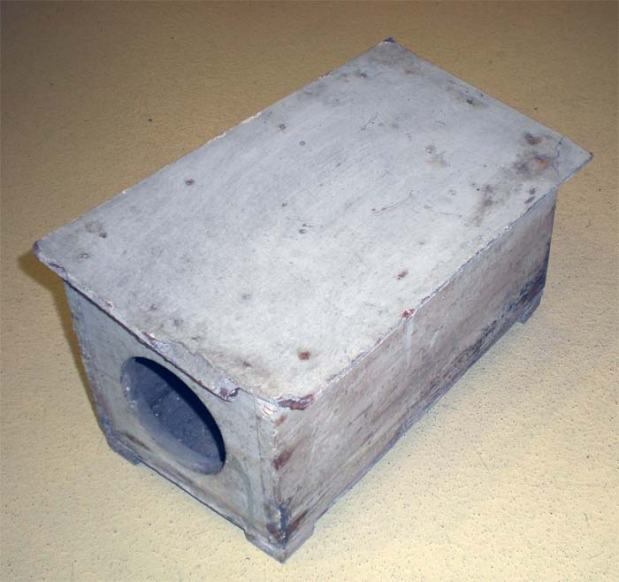 Figuras 5 y 6. Cebadero de plancha metálica. 28 cm largo, 14 cm de alto, 14 cm de ancho. Forma de caja con el techo inclinado a lo ancho.