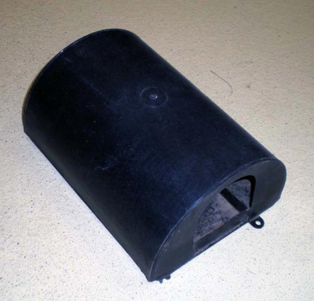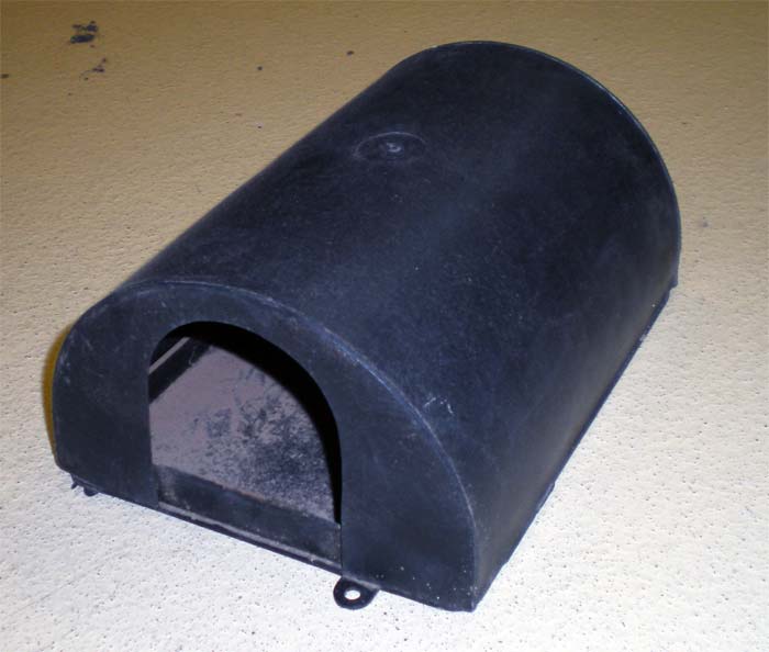 Figuras 8 y 9. Cebadero de plástico negro. 21 cm de largo, 10 cm de alto, 16 cm de ancho. Forma de caja con techo circular.