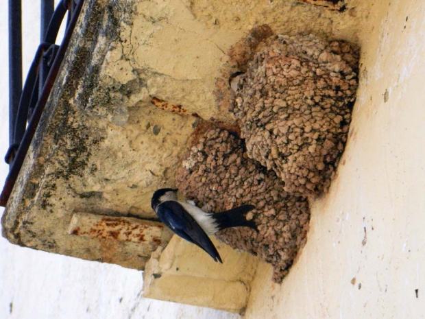 Fig 6. Avión común reconstruyendo un nido en una pared de la iglesia de Santa Coloma de Queralt (Tarragona)./ C. Pradera 05-2015