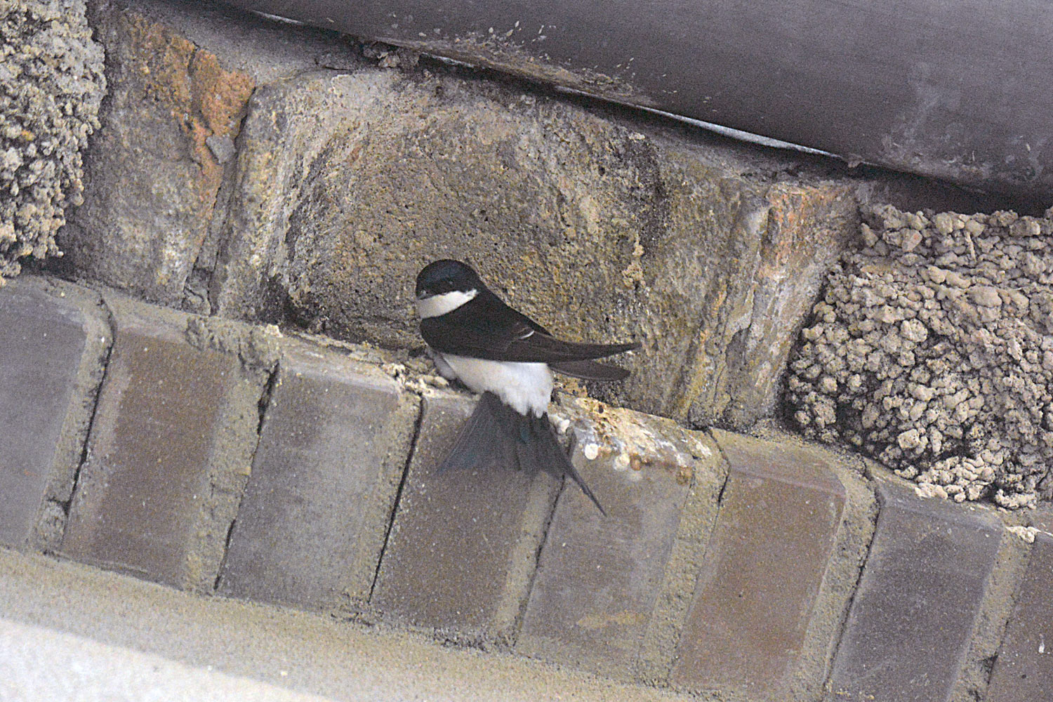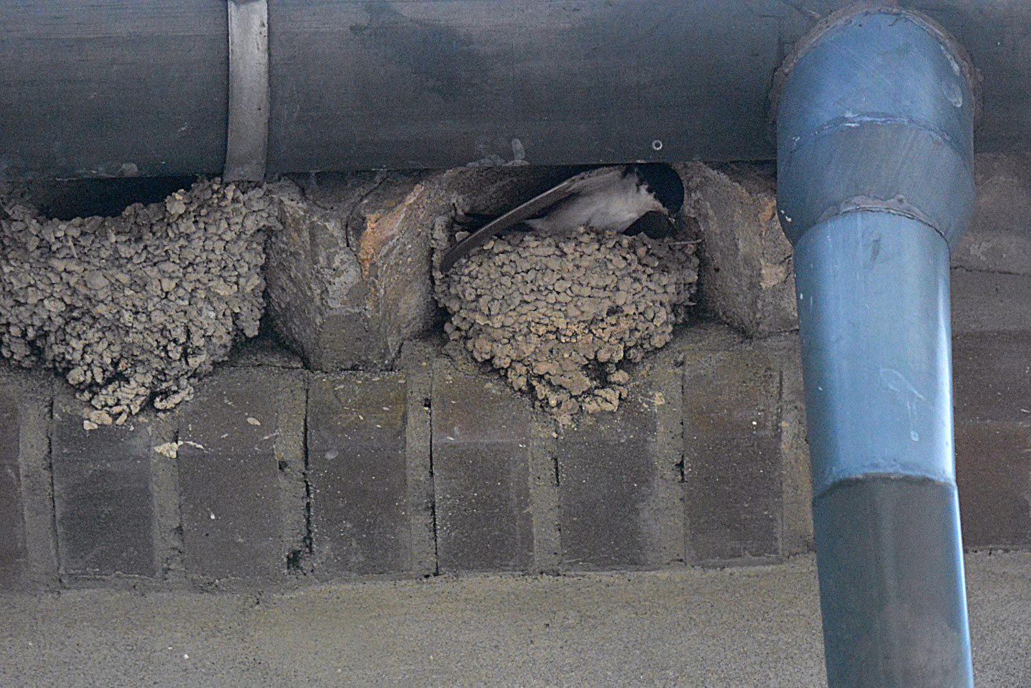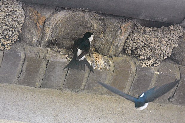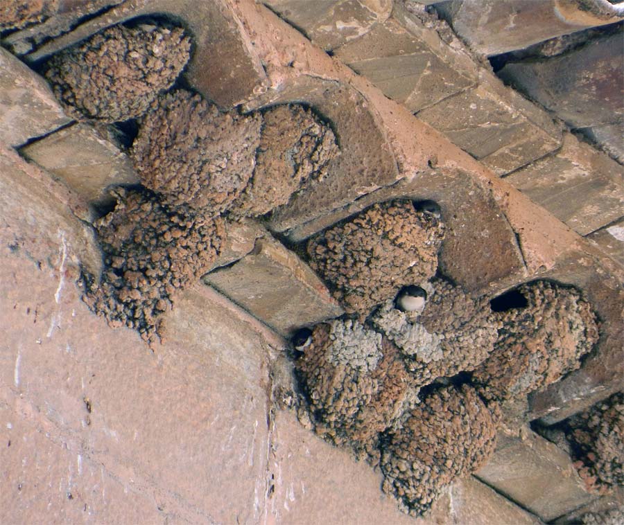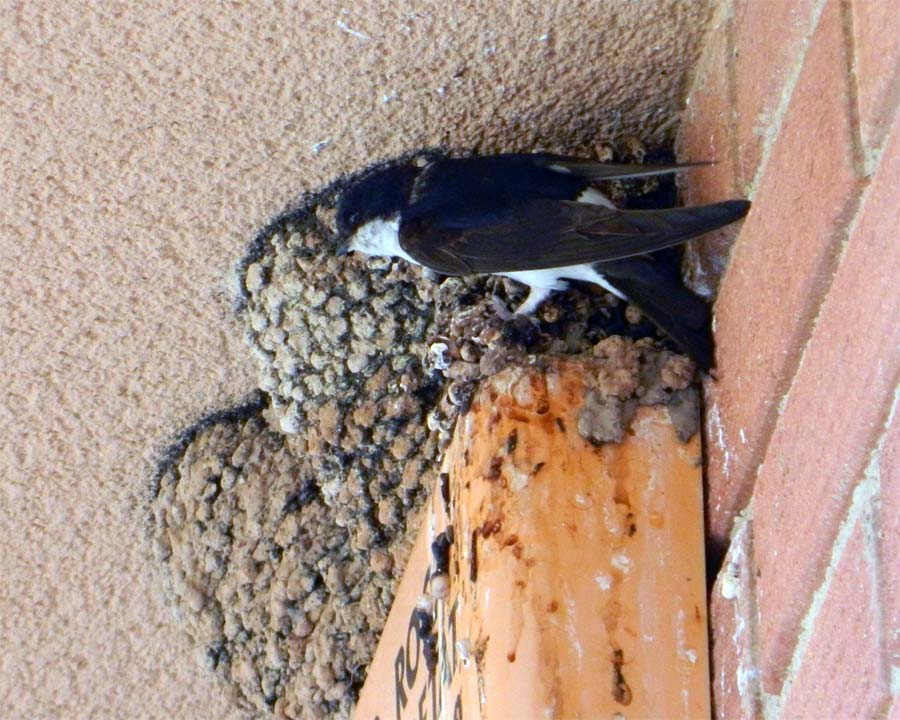 Fig 9. Avión común reconstruyendo un nido bajo el alero de una casa en Santa Coloma de Queralt (Tarragona)./ C. Pradera 05-2015