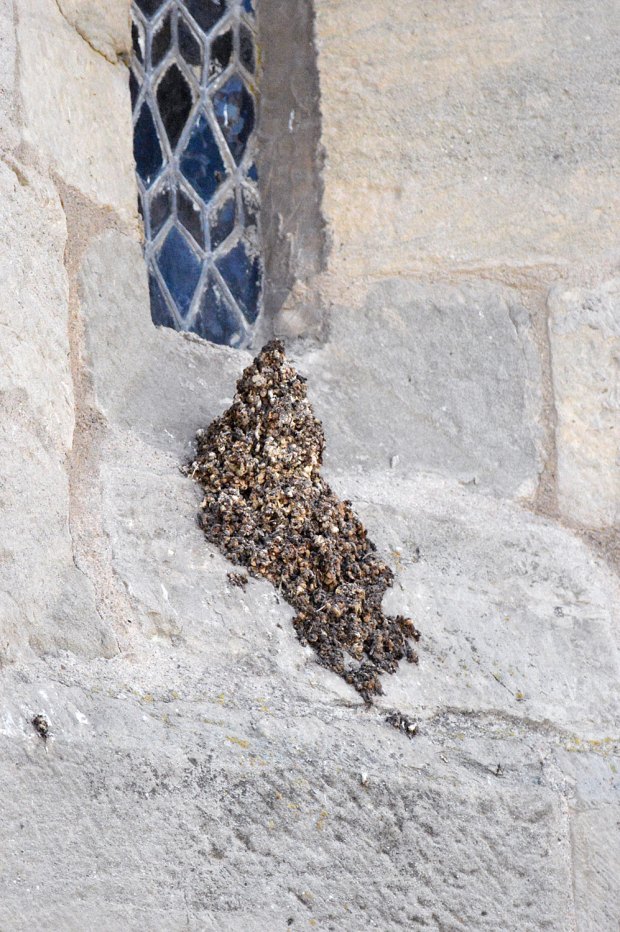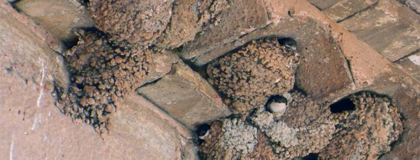Fig 7. Avión común reconstruyendo un nido en una pared de la iglesia de Santa Coloma de Queralt (Tarragona)./ C. Pradera 05-2015
