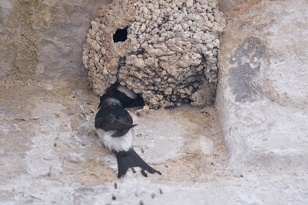 En áreas rurales, si se las deja, colma las casas con sus nidos bajo balcones (figuras 1 y 2) y aleros, o bajo cualquier otro elemento arquitectónico similar que de protección al nido construido a base de barro. El nido es toda una obra de técnica y de constancia elaborado con centenares de viajes hasta la orilla de ríos o charcas. Con las pequeñas bolitas de barro que recogen, poco a poco van levantando las paredes. El nido es cerrado con una pequeña abertura en la parte superior. Tiene una forma particular que lo diferencia del de otras aves de la misma familia. Por ejemplo, la golondrina común (Hirundo rustica) construye su nido en forma de cuenco. Y además de barro, este ave mezcla paja para hacerlo más consistente.