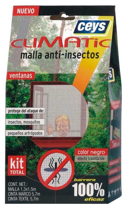 Para impedir que entren moscas, mosquitos, cucarachas o cualquier otro insecto por la ventana, no hay nada mejor que poner una malla mosquitera. Cuando se comenta esto a algún cliente, lo primero que piensa que se trata de un sistema caro. Existe un tipo de cerramiento de malla mosquitera que va por fuera de la ventana a modo de persiana. Este tipo de sistema es caro y necesita de un profesional que tome medidas y lo instale. Por suerte, hay un sistema más barato que comercializa la casa Ceys llamado Climatic Malla Anti-insectos. Este sistema consiste en una malla mosquitera de tela que se tiene que ajustar a la ventana cortándola a medida. Para pegar la tela al marco de la ventana hay que usar cinta de tipo velcro. Ceys tiene a la venta un Kit Total por unos 10 euros en el que se incluye malla mosquitera de 1’3 x 1’5 metros, cinta autoadhesiva para aplicar sobre el marco y cinta textil para pegar la malla.