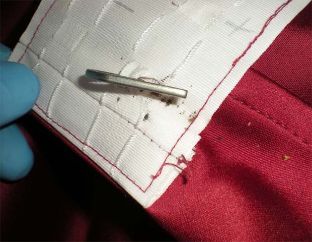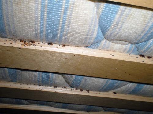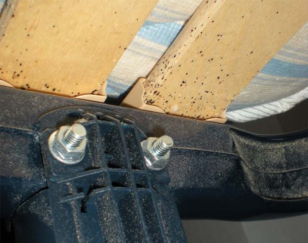 Fig 6. Chinches y huevos en el interior del anclaje de la lama a la estructura del somier. Un lugar ideal para esconderse./ C. Pradera 07-2013