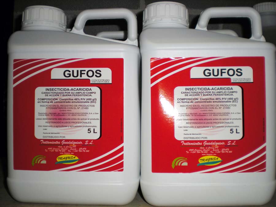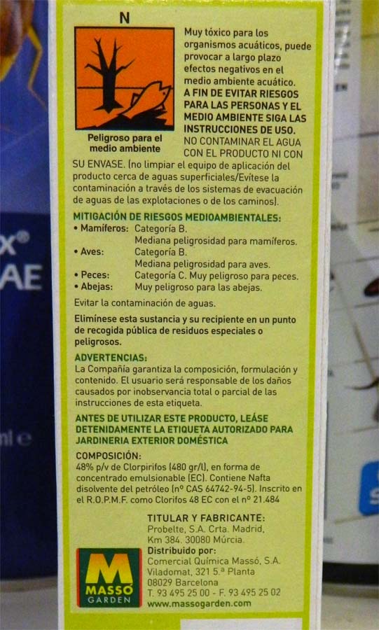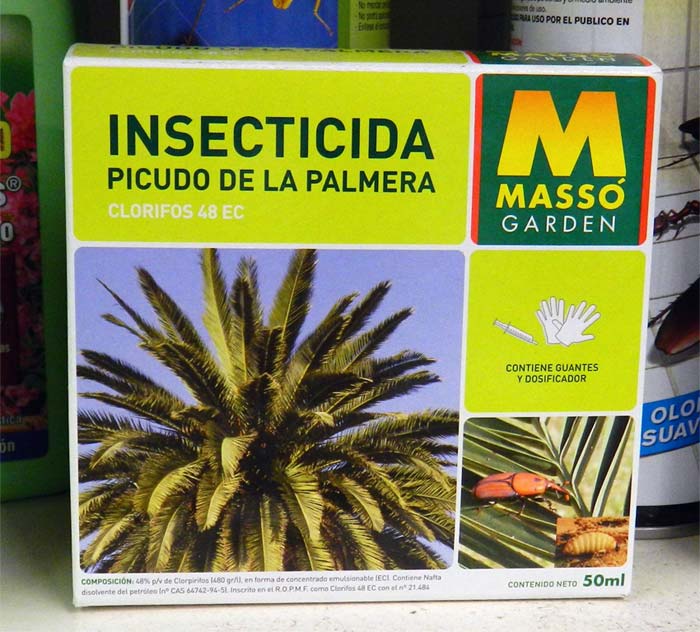 Ya hace unos cuantos años que en Sanidad Ambiental hemos dejado atrás el uso de materias activas insecticidas de la familia de los organofosforados. Clorpirifós y diazinón eran los más usados. Es cierto que estos insecticidas eran peligrosos y hubo casos de personas intoxicadas debido al mal uso. Reconozco que fue bueno que se eliminaran de Sanidad Ambiental estas materias activas. Nos dejó un poco indefensos ante plagas como las chinches, pero ha llevado a que desarrollemos más la materia gris. Ahora es importante más que nunca la inteligencia y la imaginación para desenvolverse en este sector. Ahora bien, se nos ha dicho por activa y por pasiva lo malo que era el clorpirifós para la salud. Pero si uno se da una vuelta por las estanterías de alguna tienda dedicada al cuidado de plantas, verá que se puede comprar clorpirifós sin problema. Comercial Química Massó tiene a la venta un producto para el picudo de la palmera con Registro Oficial de Productos y Material Fitosanitario (ROPMF) número 21484 (Clorifos 48 EC). Cualquier persona puede comprar un frasco de 50 mL que contiene 48% de clorpirifós. Estupendo, ¿no? Las autoridades del Ministerio de Agricultura lo han autorizado para jardinería exterior doméstica. Así que puedes tratar las palmeras o lo que gustes con clorpirifós. No hace falta conocimientos de ningún tipo, tan solo el par de guantes que hay en la caja de cartón del producto. El clorpirifós también se puede conseguir si tienes el carnet de plaguicidas fitosanitarios o eres un agricultor. Hay bastantes productos con esta materia activa. Algunos de los cuales los elabora y comercializa Tratamientos del Guadalquivir SL con sede en Carmona (Sevilla). Hace poco pasé por un almacén de fitosanitarios y aproveché para hacer una foto. En fin, estas cosas tiene la vida.