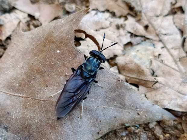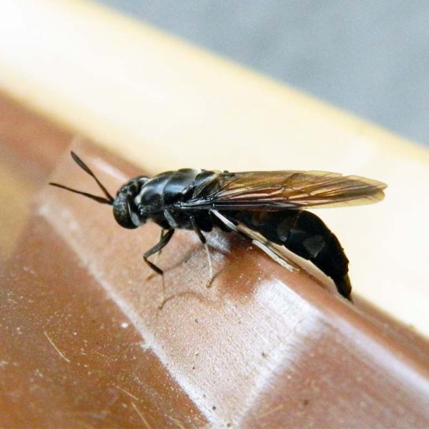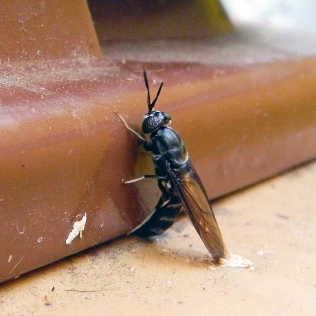 Se trata de una mosca que usa el mimetismo para protegerse. Es conocida como mosca soldado negra, cuyo nombre científicio es Hermetia illucens. Pertenece a la familia de los Stratiomyidae [1]. Esta mosca es originaria de América, aunque ha sido introducida en Europa y se ha extendido por el sur. Las larvas de esta mosca se alimentan de estiércol y de restos orgánicos [2]. Un cubo de basura para desechos orgánicos es una gran oportunidad para su desarrollo. Esta mosca completa su ciclo de vida en menos de un mes. El adulto mide 1’5 centímetros. No está considerada plaga. No va a infestar nuestras viviendas, ya que no hay nada que le interese en su interior. Sí que puede suceder que se desarrolle en gran número en un compostador.