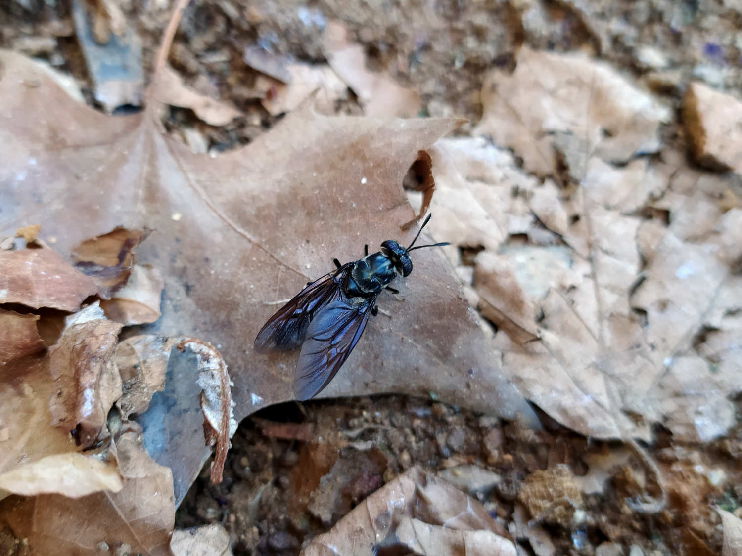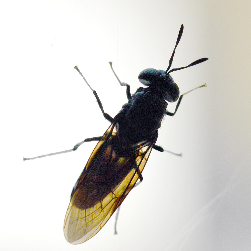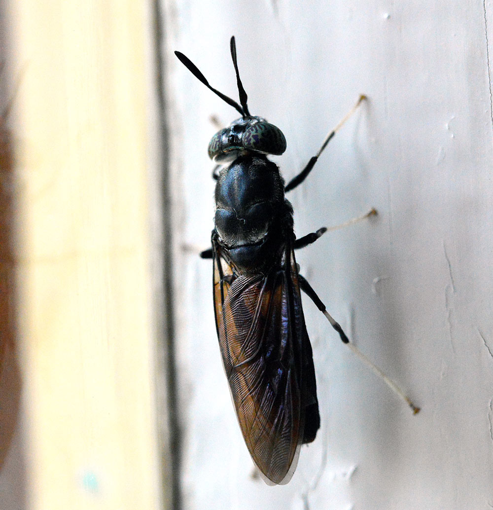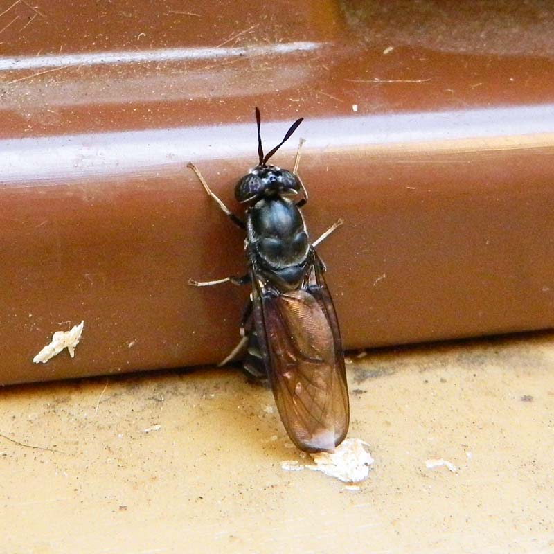 Se trata de una mosca que usa el mimetismo para protegerse. Es conocida como mosca soldado negra, cuyo nombre científicio es Hermetia illucens. Pertenece a la familia de los Stratiomyidae [1]. Esta mosca es originaria de América, aunque ha sido introducida en Europa y se ha extendido por el sur. Las larvas de esta mosca se alimentan de estiércol y de restos orgánicos [2]. Un cubo de basura para desechos orgánicos es una gran oportunidad para su desarrollo. Esta mosca completa su ciclo de vida en menos de un mes. El adulto mide 1’5 centímetros. No está considerada plaga. No va a infestar nuestras viviendas, ya que no hay nada que le interese en su interior. Sí que puede suceder que se desarrolle en gran número en un compostador.