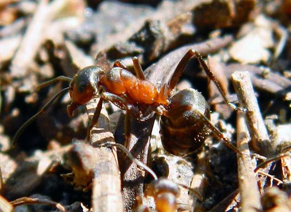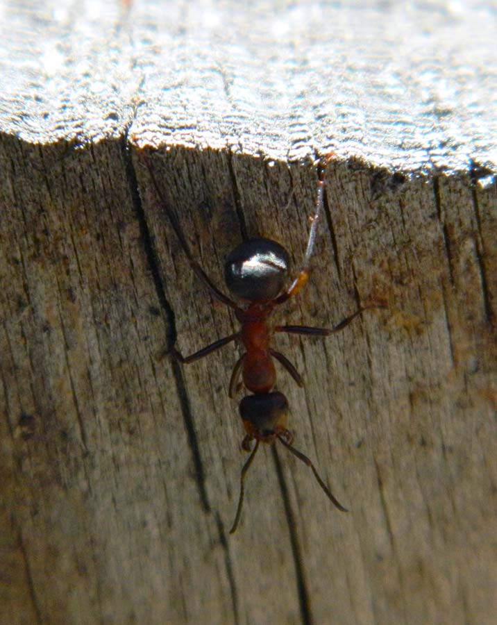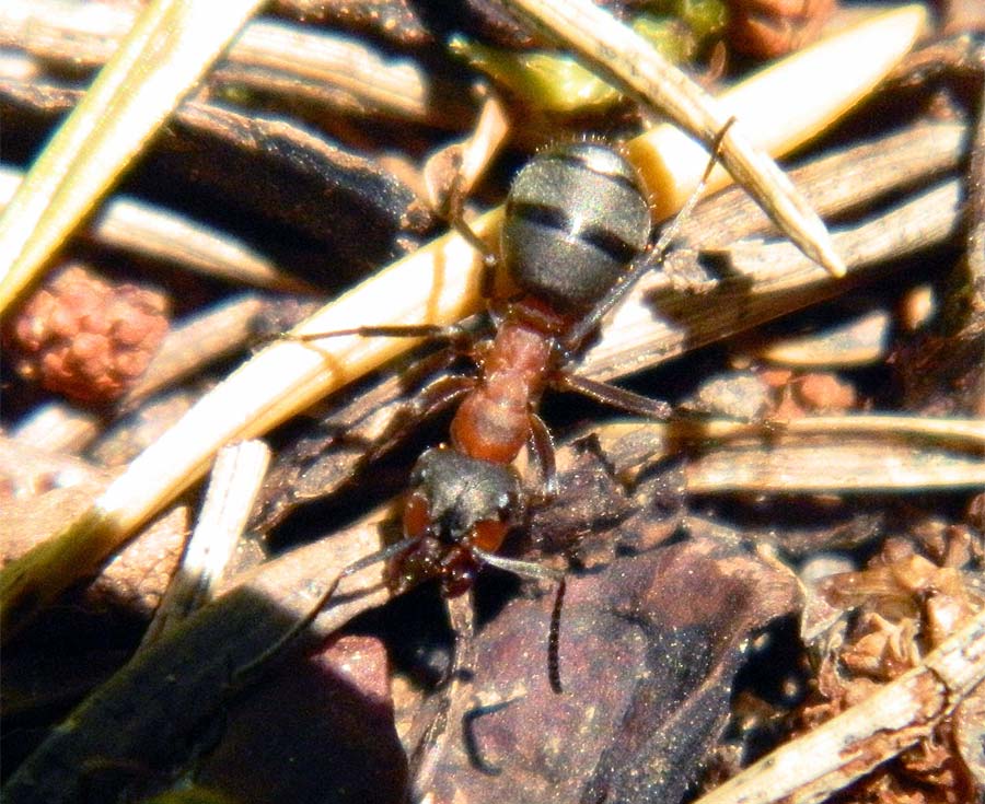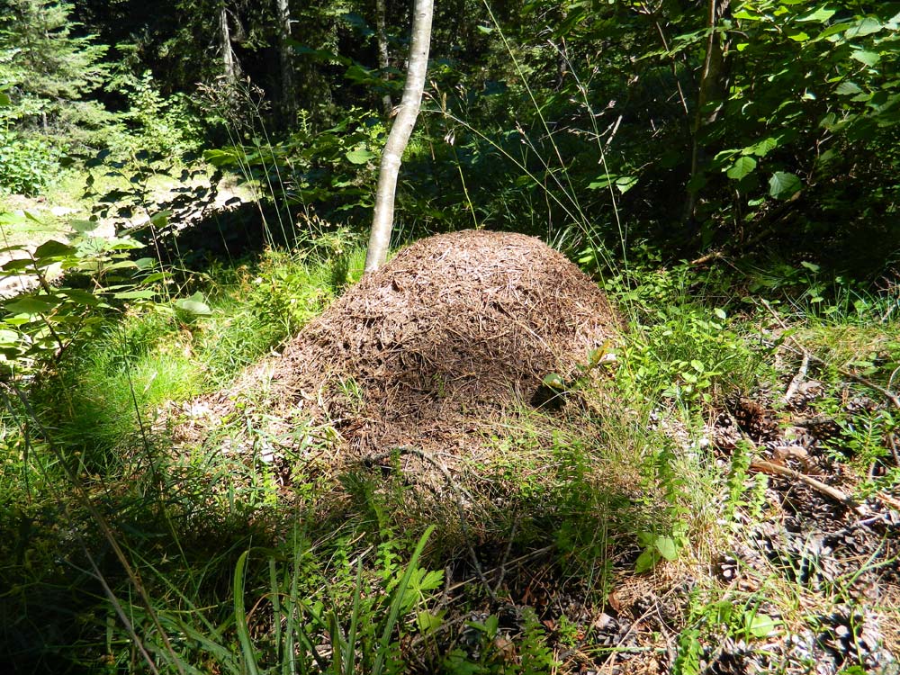 El camino por el que anduve iba en dirección al pueblo de Alp. Nada más adentrarme en el bosque, vi grandes montículos de pinaza junto al camino. Al acercarme vi que se trataba de construcciones levantadas por hormigas del género Formica. Estas construcciones reciben el nombre de ‘domos’ y están formados por material que recolectan de la zona cercana al nido. En este caso acículas y ramitas de abeto, pero también pequeñas piedras y lo que encuentren. Estaba todo el bosque tomado por lo que parecía una misma especie de hormiga. Había montículos cada pocos metros. Hice fotos y me llevé unos cuantos ejemplares de obreras a casa para su identificación. Hoy me he entretenido mirando a través de la lupa binocular. Buscando información sobre las especies de Formica que construyen domos, he visto que se podía tratar de dos especies. O bien eran Formica pratensis o bien Formica lugubris. Ambas son muy parecidas. Aunque si se miran bien ambas especies, se pueden diferenciar en el tamaño y número de las quetas que recubren el cuerpo. La Formica pratensis tiene muchos más pelos y más finos que la Formica lugubris. Así pues, los hormigueros que vi pertenecían a esta última especie. Por otra parte, F. pratensis se encuentra por debajo de los 1.000 metros y forma sus domos en prados. Las obreras de la muestra medían unos 8 milímetros.