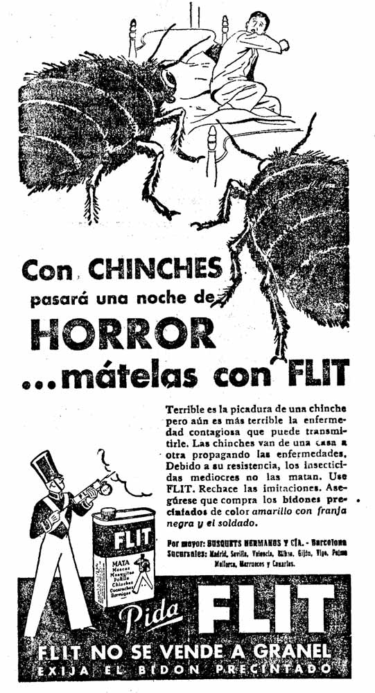 Estaba mirando antiguos anuncios publicitarios aparecidos en prensa escrita, cuando me he encontrado con uno interesante (figura 1). Fue publicado en 1934 en el periódico La Vanguardia de Barcelona. Se trata de un anuncio bien diseñado. En la parte superior se puede ver una persona que va a ser atacada por unas chinches de cama gigantes. Bonita magnificación de la perturbación psicológica que siente una persona que padece una infestación de chinches de cama en su casa. En la parte inferior, está el icono del insecticida Flit, el soldadito con traje militar decimonónico, atacando a las chinches con un pulverizador de émbolo.