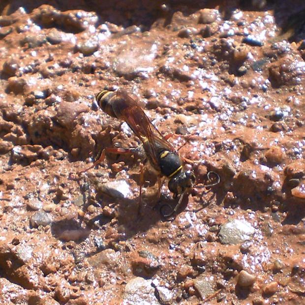 Las responsables de la construcción de las celdas en forma de vasija son las hembras. Recogen una bolita de barro que transportan hasta el lugar elegido para construir la celda. Moldean el barro en capas sucesivas que van dando forma a la vasija. Cuando está construida, la llenan de arañas que cazan, pero que no dan muerte para que se mantengan frescas. Entonces depositan un huevo en su interior y sellan con barro la celda. La larva se desarrollará hasta alcanzar la fase de pupa.