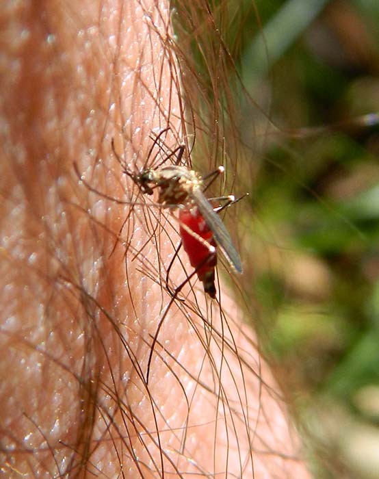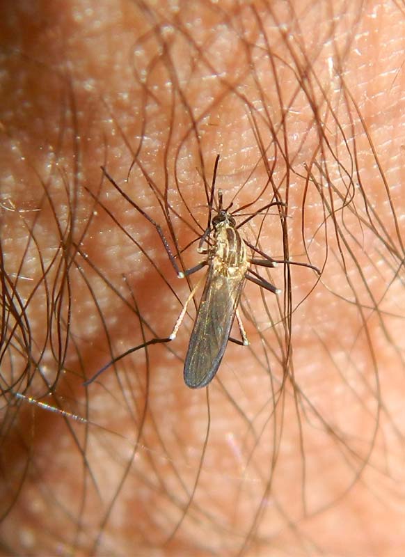 Vi que un mosquito se acercaba. Mi curiosidad hizo que me quedara quieto para saber qué especie de mosquito era. Después de dar algunas vueltas a mi alrededor, se fue hacia mi tobillo. Cuando ya estaba confiado buscando clavar su probóscide, aproveché para tomar unas fotos (figura 1). Cerca mío estaba mi mujer y le pedí que me pasara uno de los frascos que llevaba para recoger muestras. En poco tiempo el mosquito me sacó sangre. Lo pillé justo antes de que emprendiera el vuelo. Lo estuve observando. No conocía la especie. Media hora después, estaba delante de otro hormiguero haciendo fotos y vi que se acercaba otro mosquito. Este estuvo un buen rato buscando dónde posarse. Yo estaba quieto e intentaba dirigirlo hacia mis piernas para poder tomar fotos. Al final lo conseguí y lo retraté (figuras 2 y 3). Me di cuenta de que ambos mosquitos eran muy parecidos y, con toda probabilidad, pertenecían a la misma especie.