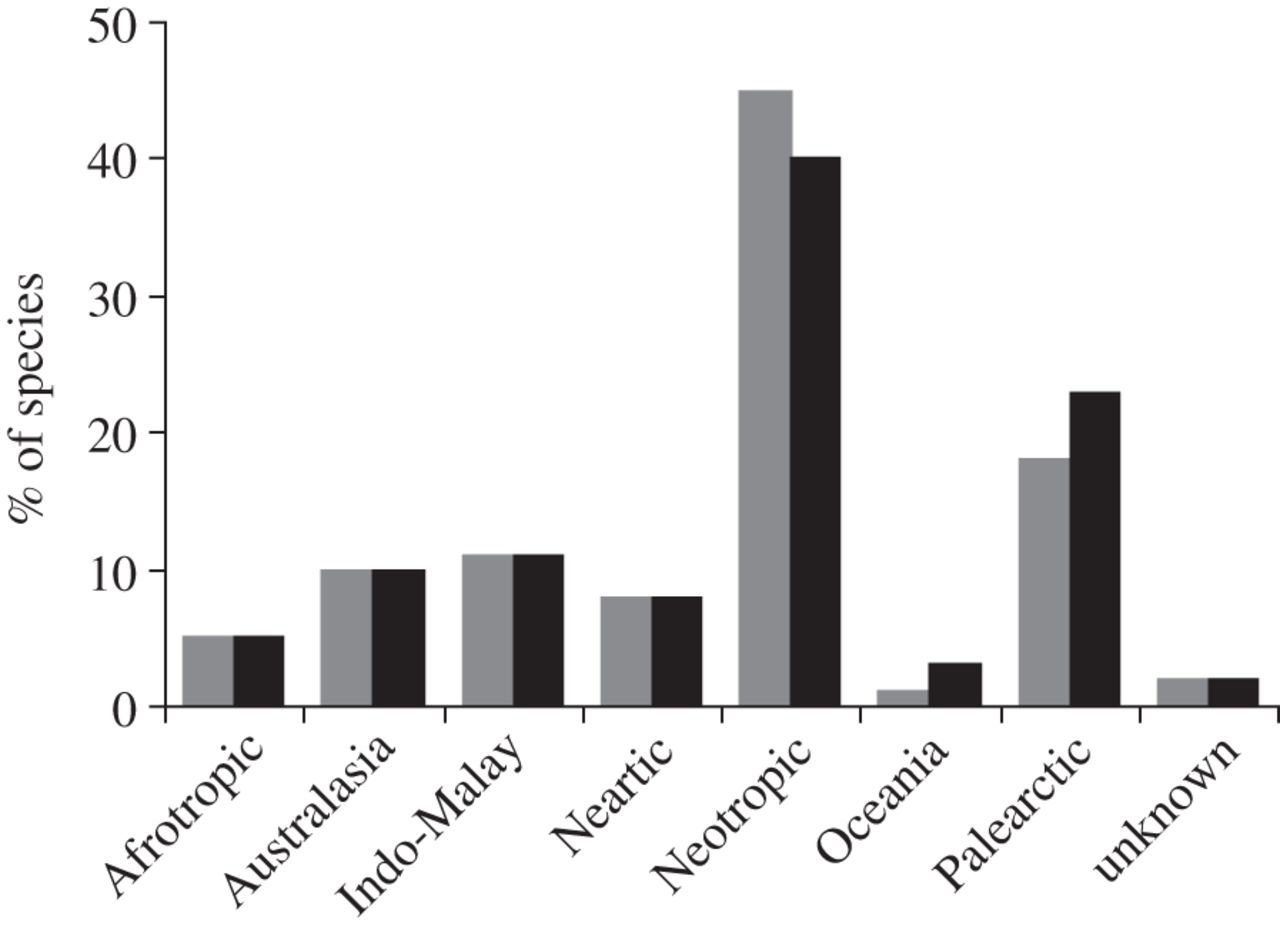 Fig 1. Porcentaje de especies introducidas (gris, n=253) y establecidas (negro, n=145)./ Miravete et al. (2013) [2]