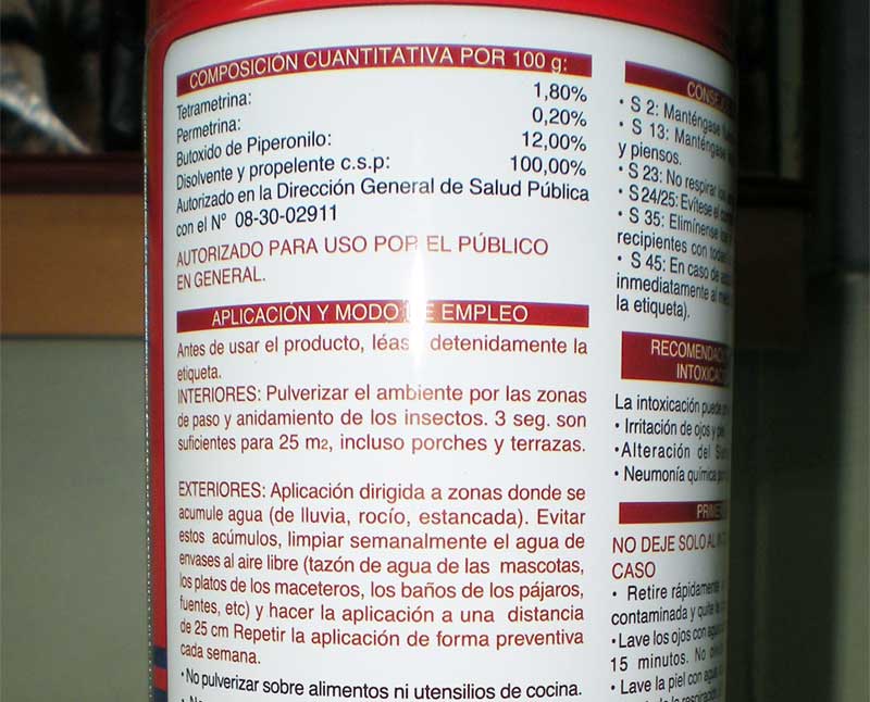 Es interesante leer la etiqueta de la cara posterior (figura 2). Justo debajo del apartado de la composición cuantitativa, está el de modo de uso. En la aplicación para interiores no aparece nada nuevo que no se pueda leer en otros insecticidas. Se pulveriza el ambiente como quien saluda con la mando. El resto lo hacen los propelentes y disolventes que dispersan las materias activas. Pero en la aplicación de exteriores tan solo se puede leer que debe ser «dirigida a zonas donde se acumule el agua (de lluvia, rocío, estancada)». Se dice que la aplicación debe ser a distancia de 25 centímetros y repetirla de forma preventiva cada semana. Tras leer esto, me viene a la mente el dicho de que para este viaje no hacían falta estas alforjas. Sencillamente, si usted tiene agua estancada en la terraza de casa, elimínela y se acabaron los mosquitos. No tiene sentido gastarse el dinero en un insecticida que es de los más caros y usarlo para contaminar el aire. Tampoco creo que rociar de esta manera agua estancada donde haya larvas de mosquito sirva de mucho. Quizás se pueda matar algunas larvas que no hayan huido al fondo cuando nos acerquemos. Pero creo que las pupas no las vamos a eliminar usando el insecticida como se nos indica. En fin, este posteo es tan solo una opinión.