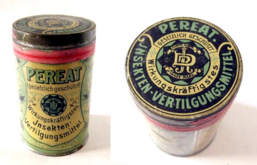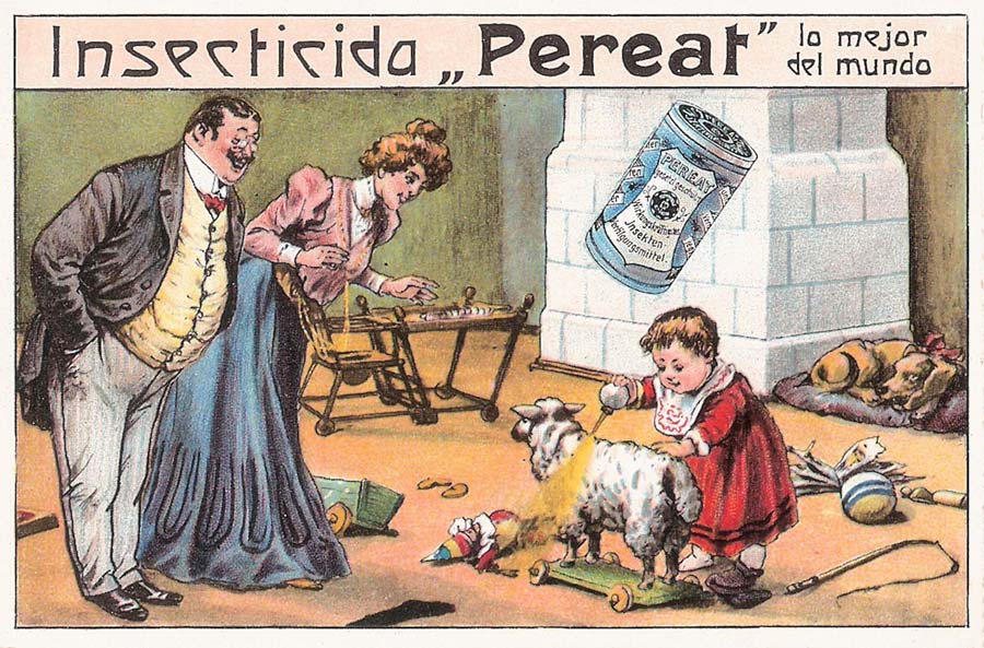 Pereat fue una marca comercial de polvos insecticidas a base de pelitre. Por lo que he averiguado, tuvieron éxito comercial en España a principios de siglo XX. La información que he encontrado sobre la marca es poca. No sabía quién fabricaba este producto hasta que he adquirido una cartulina publicitaria (figuras 1-2) y he profundizado en el tema.