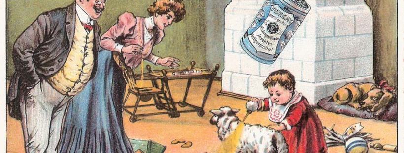 En el anverso (figura 1) se puede ver una bella estampa que muestra la aplicación de los polvos insecticidas Pereat. Con este dibujo el fabricante nos quiere enseñar las bondades del producto. Una imagen vale más que mil palabras. Pereat es aplicado por una niña para desinsectar a un cordero de juguete bajo la mirada atenta y amorosa de unos padres de clase acomodada. La niña está además rodeada de juguetes. Deducimos de esto que el insecticida es inocuo para las personas y que es tan fácil de aplicar que hasta los niños lo pueden hacer. Además la estampa transmite salud, higiene y buenos hábitos.