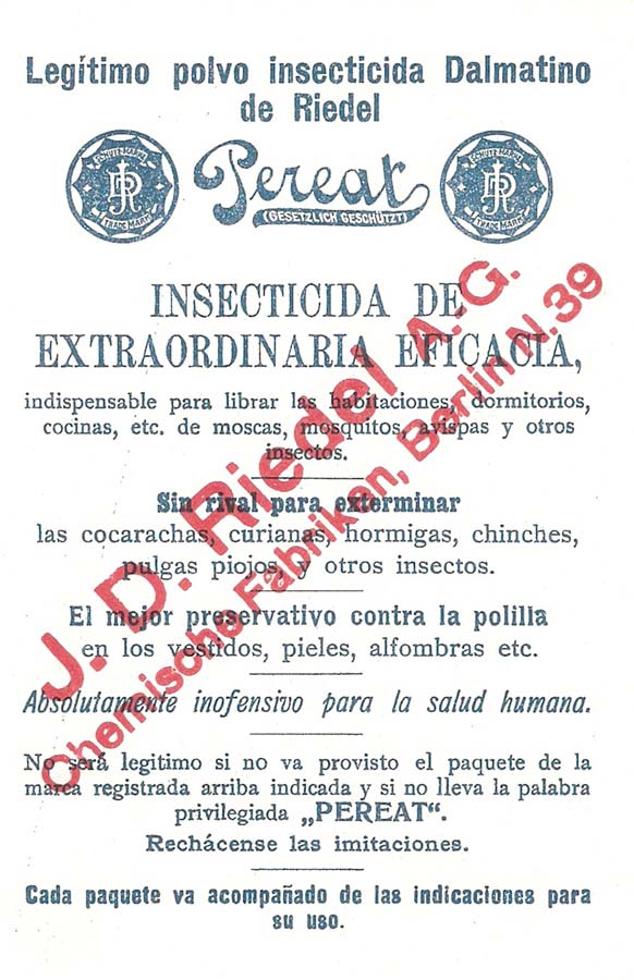En el reverso de la cartulina publicitaria se nos informa de quién es el fabricante. Se puede leer en letras rojas y dispuestas en diagonal. El nombre del fabricante es J.D. Riedel AG con fábrica química en Berlín [2]. Buscando en internet, he dado en la wikipedia con el framacéutico Johann Daniel Riedel (1786-1843). Esta persona se hizo cargo en 1814 de una farmacia en Berlín y dio origen a una saga de farmacéuticos alemanes. La farmacia fue el origen de un negocio de productos químicos que parece que sigue en funcionamiento hasta hoy día [3]. En la década de 1940, J.D. Riedel AG se fusionó con otra empresa química llamada Chemische Fabrik Eugen-de Haën. La fusión dio paso a otra empresa bajo el nombre de Riedel-de Haën AG. En 1999 pasó a manos de Honeywell bajo la denominación de Honeywell Specialty Chemicals Seelze.